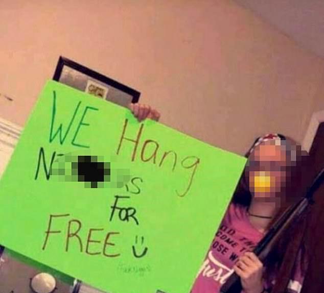 A high school girl has been slammed by the public after sharing a picture in which she’s holding a gun and a sign that read: “We hang ni**ers for free.