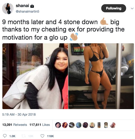 “9 months later and 4 stone down. Big thanks to my cheating ex for providing the motivation for a glo up,” Shanai wrote on Twitter where she shared her incredible transformation.