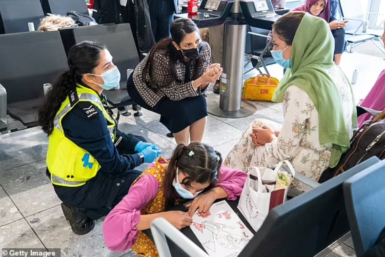 UK’s Home Secretary Priti Patel was also photographed talking to an Afghan mother and her children at Heathrow Airport.