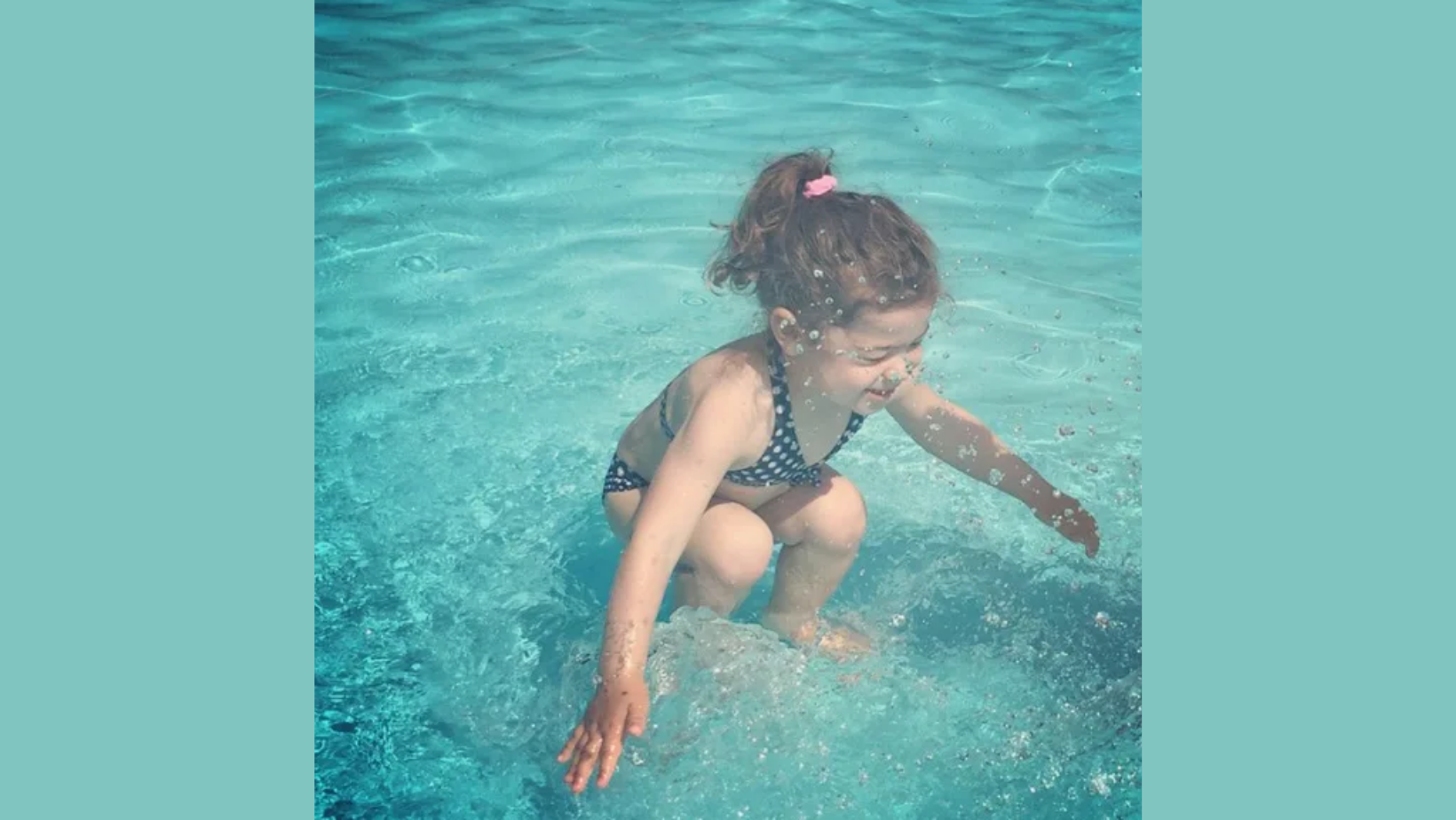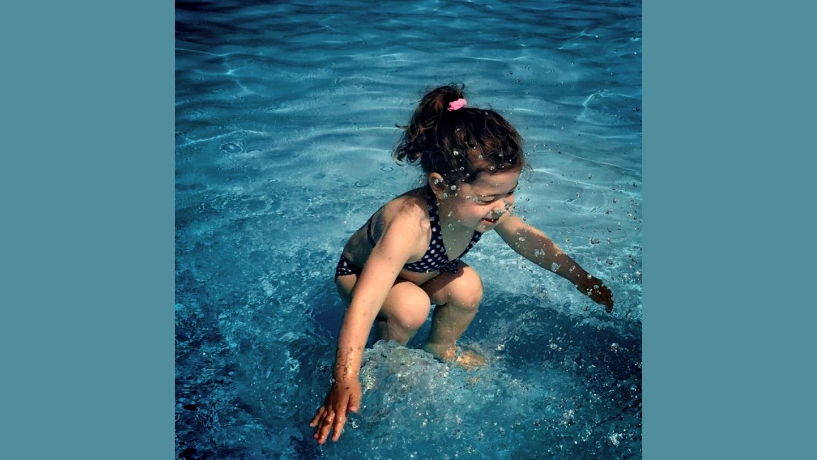 At first look, the bright blue background of the pool water and the splashes around the little girl’s face makes it look like that she is swimming underwater.
