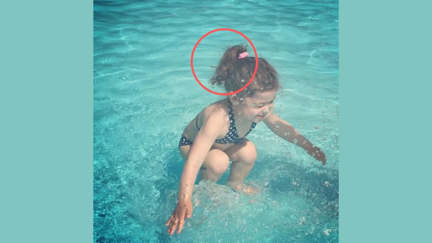 BUT if you take a closer look at her hair, it is tied up in a cute ponytail and is dry! This means she must have just jumped into a swimming pool.