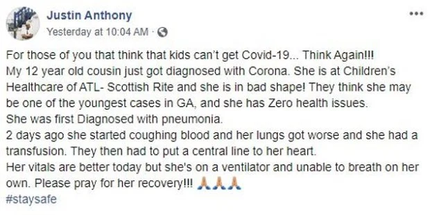 “Here’s a 12-year-old fighting for her life,” he said. “People need to practice social distancing. People need to take care of their children.”