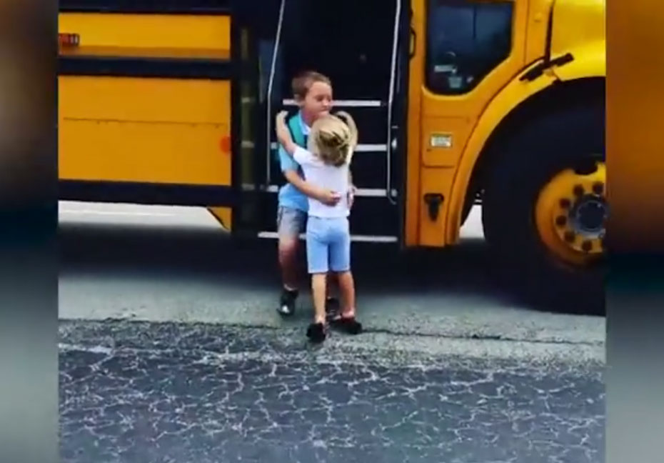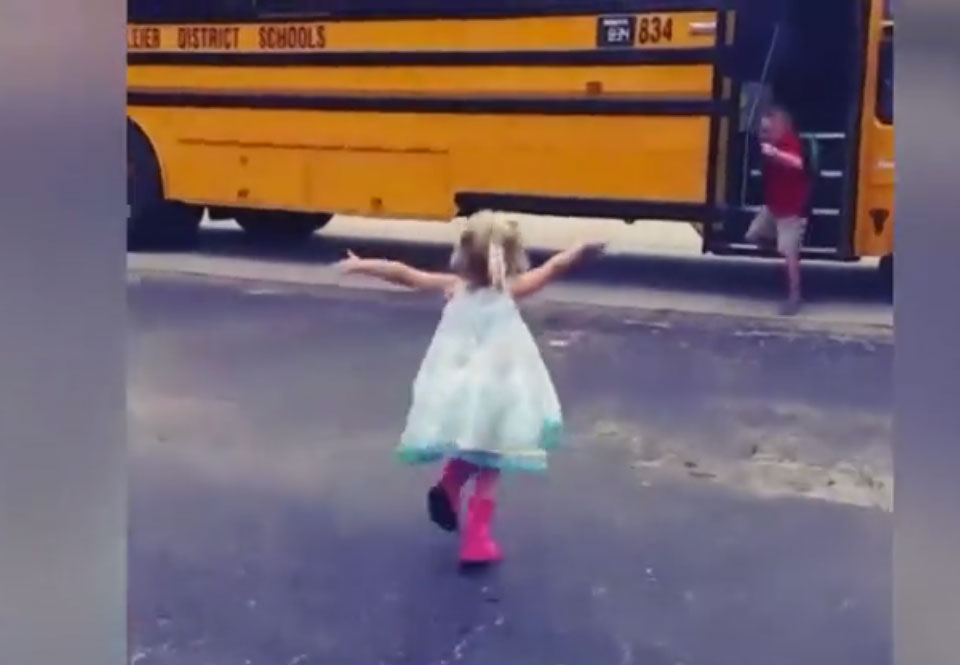A small girl has a special routine, every day she waits for the bus to give her brother a hug after school. She feels so happy after seeing her brother who also smiles when he sees his sister running towards him.
