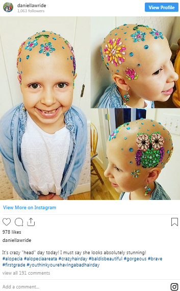 Sensing an opportunity to make her daughter stand out from the rest, Dianella decided to deck her daughter’s bald head with glittery stickers. It was time to say out loud that bald is beautiful.