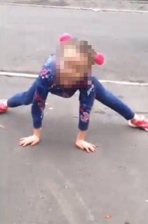 The foul-mouthed child, who was wearing pink trainers and a flowery top, dropped to the floor as she shouted expletives. She talked to the woman through metal gates and dared her to take photos of her.