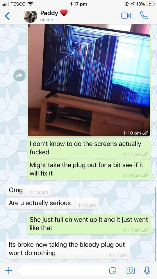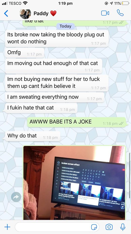 Danielle sent a message to her boyfriend saying her cat has destroyed the TV and she’s going take the plug out for a while to see if it works after that.