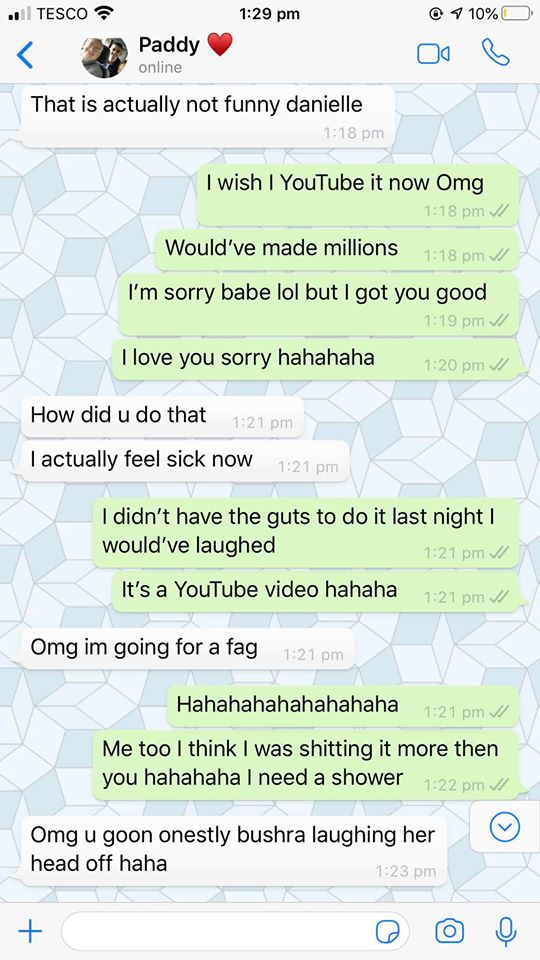 Danielle shared the screenshot of their conversation on Facebook with the caption: ‘HAHAHAHAHAHAHA 1-0 to me when paddy thinks the cats actually broke the telly but it’s a YouTube video hahahahaha’.