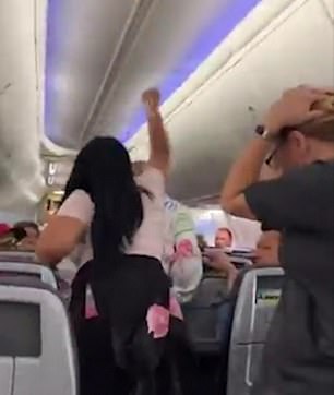 A furious girlfriend left passengers on a flight stunned after she hit her boyfriend’s head with a laptop, saying he ‘looked at another woman.