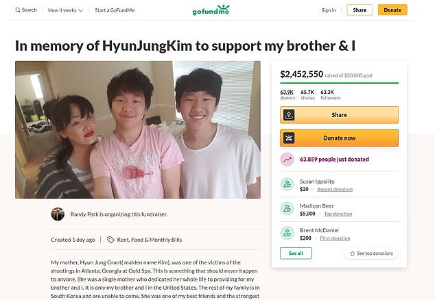 A GoFundMe campaign set up for the two sons of a Georgia spa shooting victim has raised more than $2 million in just 24 hours.