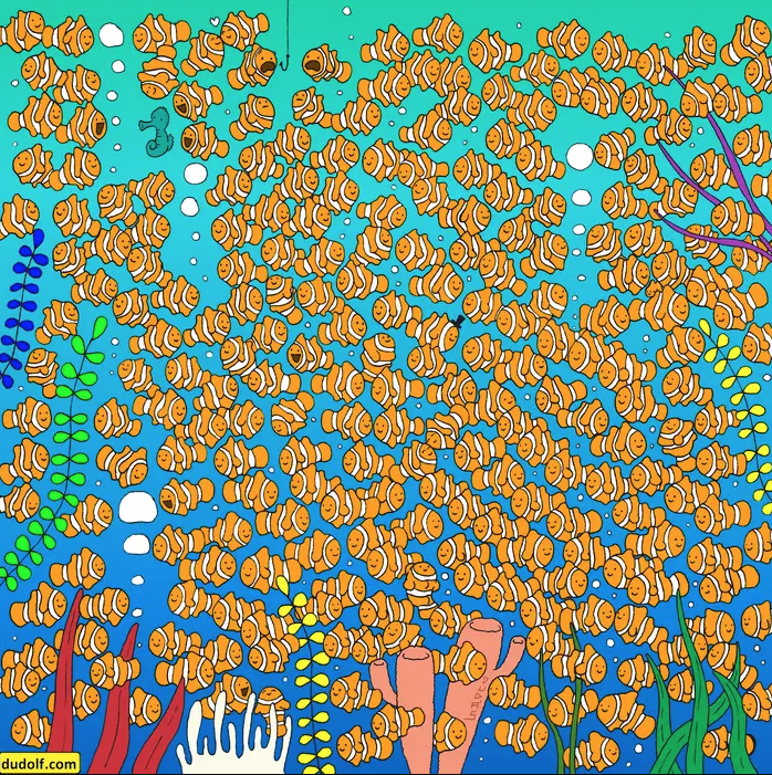 The tricky visual puzzle —which was created by Hungarian cartoonist Gergely Dudás aka Dudolf to his fans— features a bunch of vibrantly fishes under the sea!