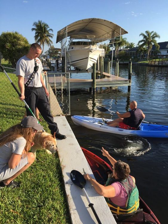 “They called the Cape Coral Fire department which rescued her. I was going to keep her in my lanai until Lee County Animal Control arrived. I was walking back to open the lanai door when I saw two people in Kaiaks looking for a dog.”