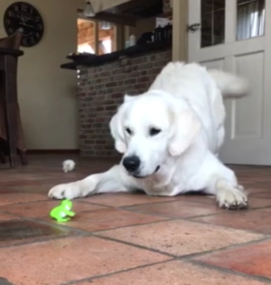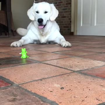 The Golden Retriever tries to seize the mechanical frog, considering it a source of threat. Not being able to stop the frog from jumping and the frog’s refusal to submit to the dog makes him quite angry.