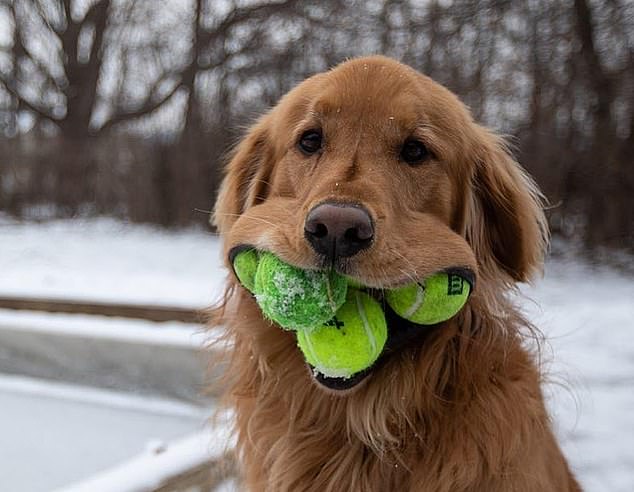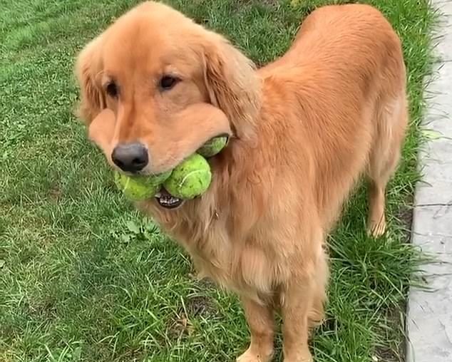 Finley who is a six-year-old Golden Retriever from Canandaigua, New York, can pick up the tennis balls with his mouth all by himself.