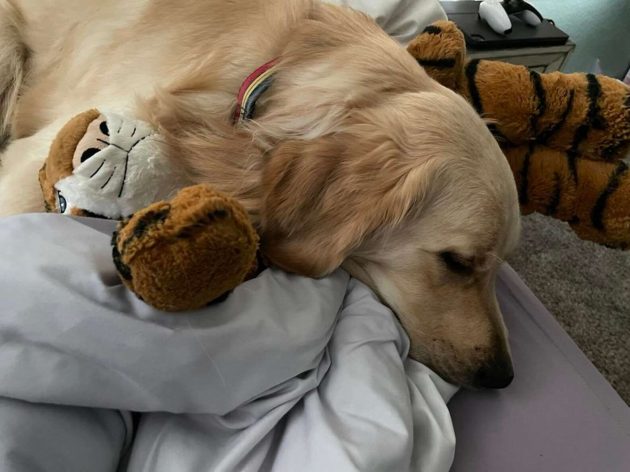 The golden retriever has been obsessed with his toy since he was just a puppy.