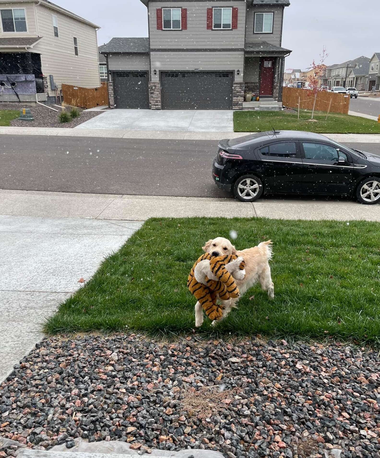 A dog went viral after he became so excited to see snow for the first time that he decided to show the snowflakes to his stuffed toy.