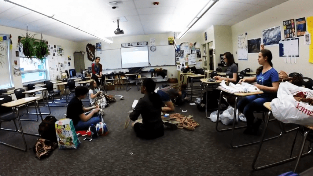 Shelby created a club where students came together, collected all kinds of plastic bags they could and made Plarn blankets for the homeless.