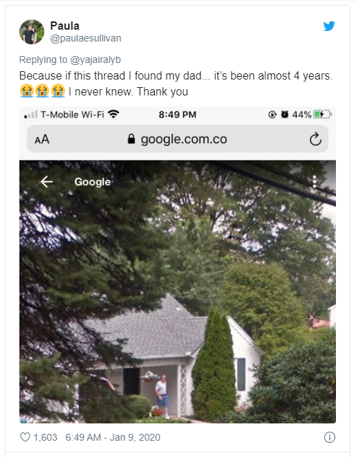 Currently, Andrea and a lot of others are posting photos of their loved ones from Google Street View on Twitter. The original tweet which started the thread has gone viral with over 500,000 likes on it.