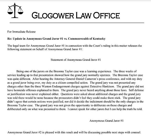 The juror also added that only wanton endangerment charges against one of the Louisville police officers were presented by Attorney General Daniel Cameron.