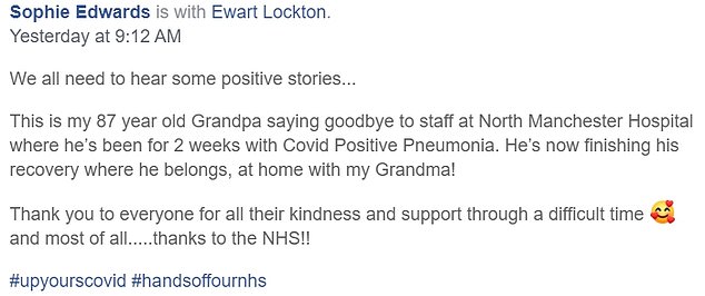 “We all need to hear some positive stories…” Sophie said. “This is my 87-year-old grandpa saying goodbye to staff at North Manchester Hospital where he’s been for two weeks with covid positive pneumonia.”