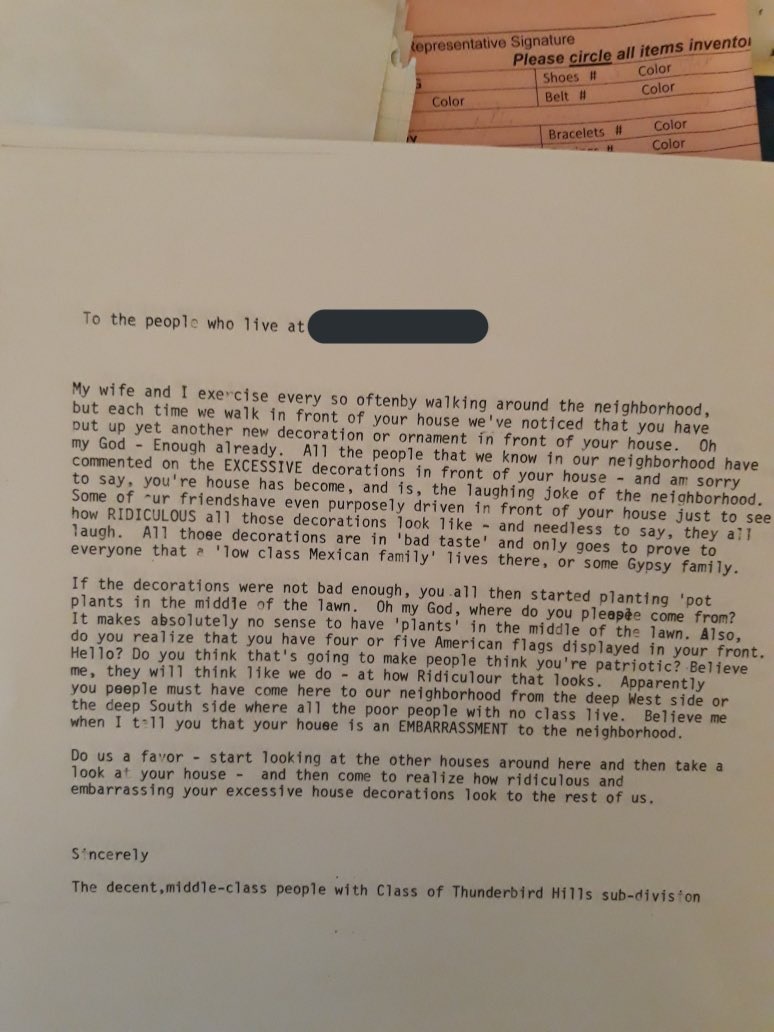 “Some of our friends have even purposefully driven in front of your house just to see how RIDICULOUS all of those decorations look like – and needless to say, they all laugh. All those decorations are in ‘bad taste’ and only goes to prove to everyone that a ‘low class Mexican family’ lives there, or some Gypsy family.”