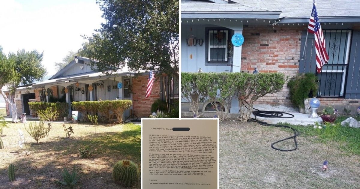 A grandfather attempting to decorate his property was slammed by his neighbor in a cruel letter in which the nosey neighbor accused him of putting up “low-class” decorations and called his home “the laughing joke of the neighborhood.