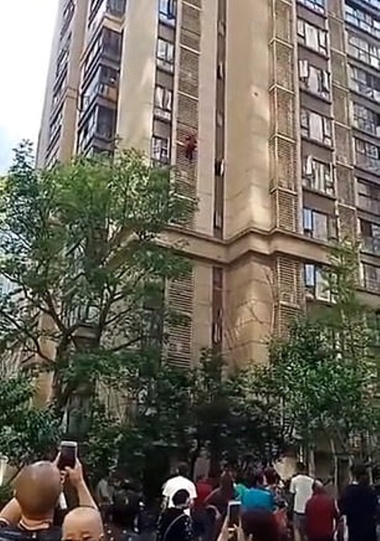 The video showed a crowd of concerned people watching as she slowly made her way down by stepping on the air-con units’ ventilation covers.