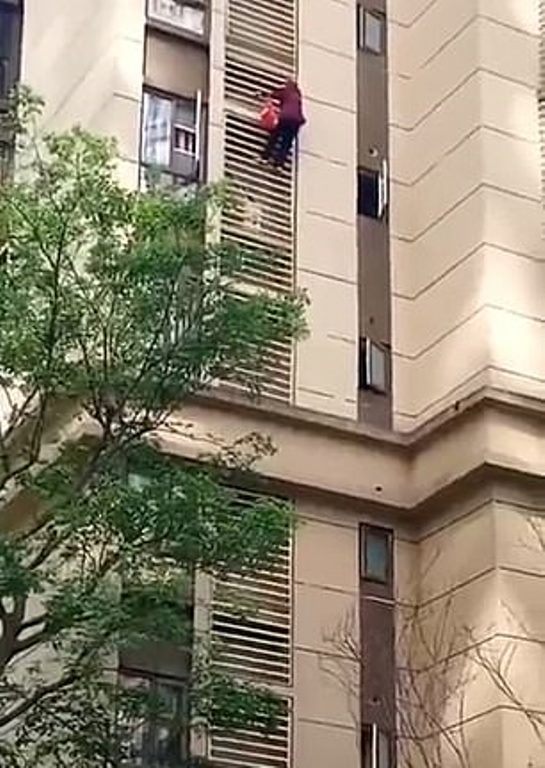 This is a horrifying moment a 90-year-old grandma with dementia scaled nine floors down the outside of a building after her worried family locked her inside the apartment to keep her safe.