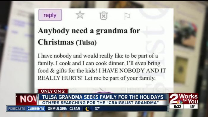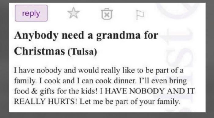 “Anybody need a grandma for Christmas?” the post read. “I can cook, and I can cook dinner. I’ll even bring food and gifts for the kids!”
