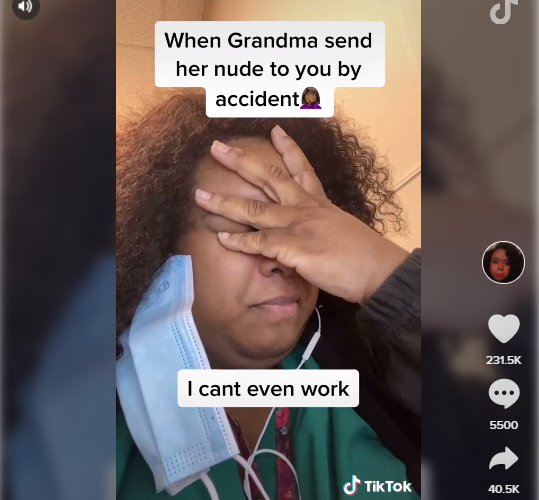 The voice clip playing the background of the video made it funnier, with an older woman explaining: “This is your grandmother. I apologize so much. I sent you pictures I pushed your name by mistake.