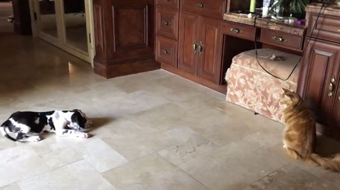 Mostly, cats and dogs don’t get along well with each other but some become best of friends. Here’s an adorable video of a Great Dane puppy who is trying to befriend a cat.