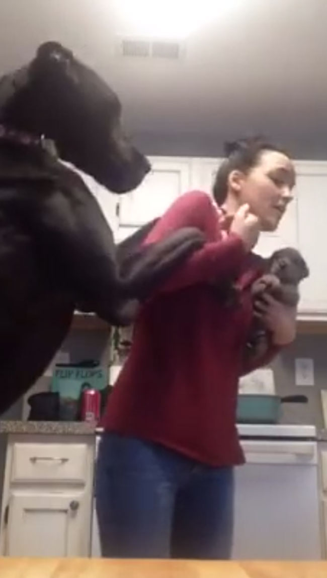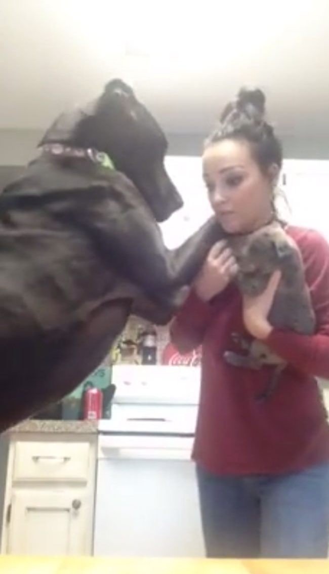 A hilarious video of a Great Dane getting jealous after his owner cuddles her new puppy is going viral on the Internet.