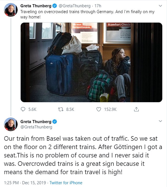 Greta Thunberg was scolded by a German railway service after she shared a picture of herself sitting on the floor of an “overcrowded train” on her way back to Sweden.