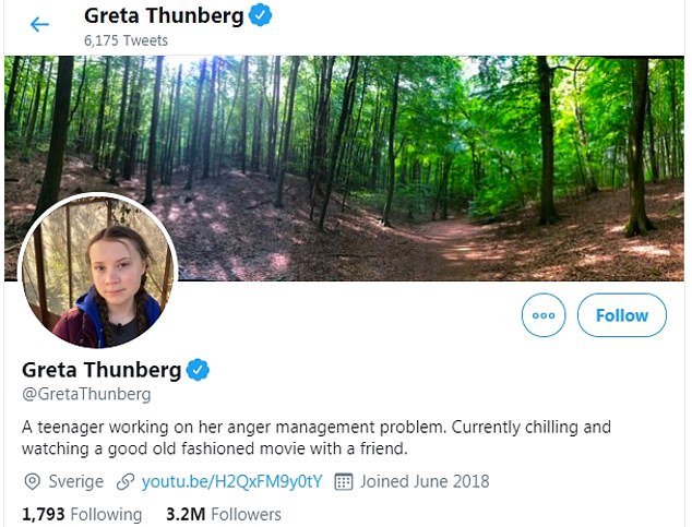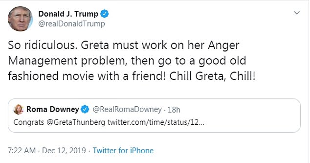 He tweeted: ‘So ridiculous. Greta must work on her Anger Management problem, then go to a good old fashioned movie with a friend! Chill Greta, Chill!’