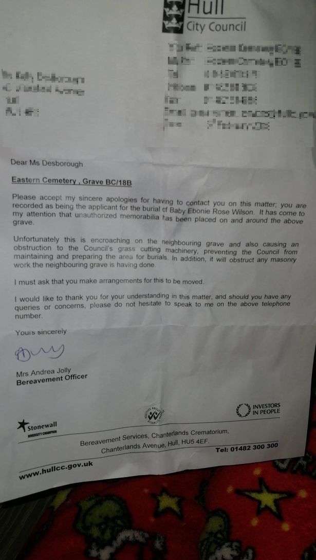 Hull City Council ordered grieving parents to remove all decorations, including flowers and toys, that they’ve placed on their stillborn daughter’s grave shortly after her burial.