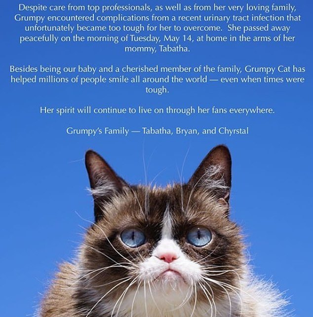 “Besides being our baby and a cherished member of the family, Grumpy Cat has helped millions of people smile all around the world – even when times were tough. Her spirit will continue to live on through her fans everywhere.”