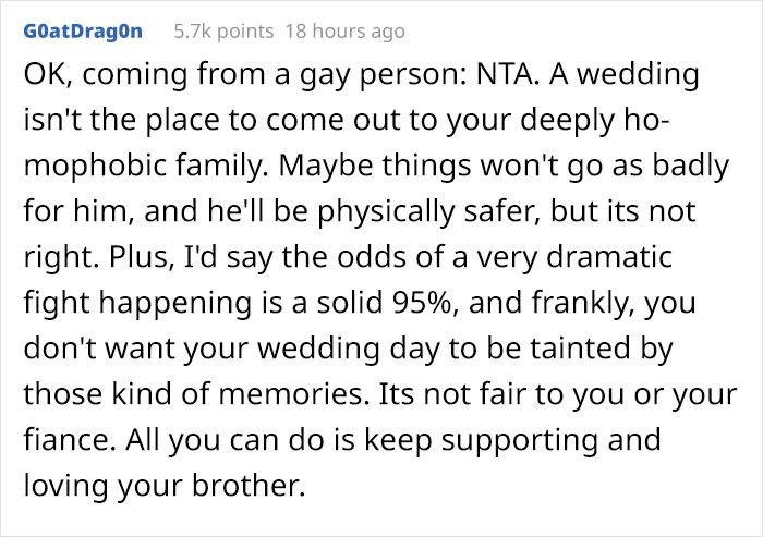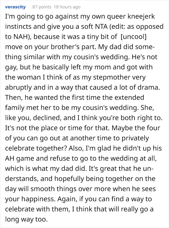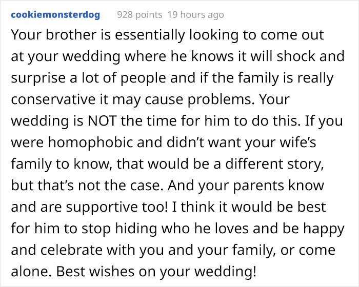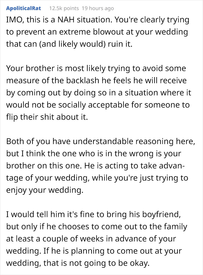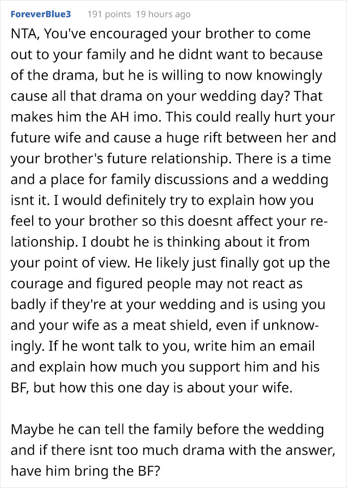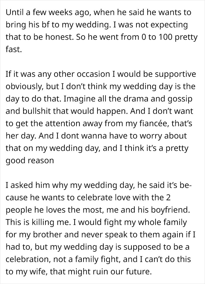This particular scenario is difficult for a guy who has to choose between hurting his beloved brother’s feelings or potentially ruining his wedding – something that means the world to his fiancee.