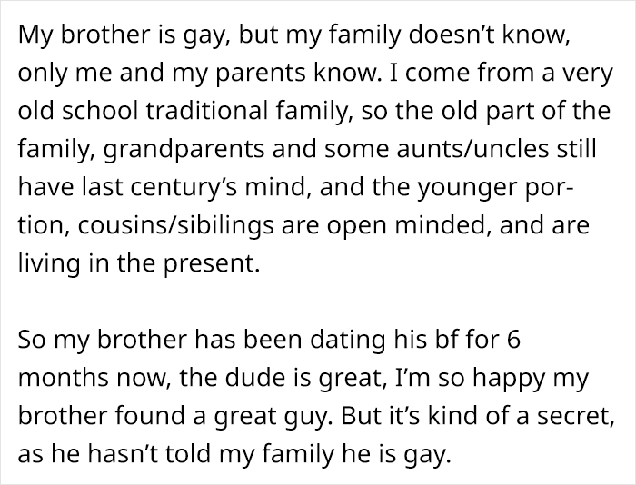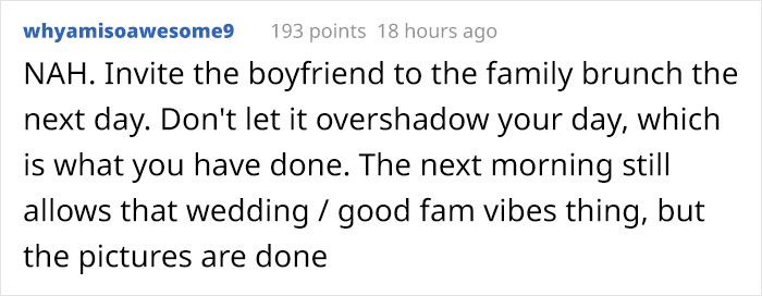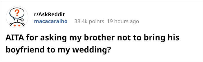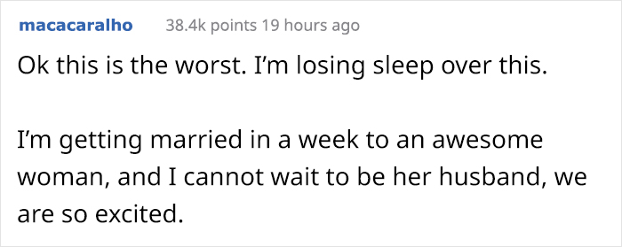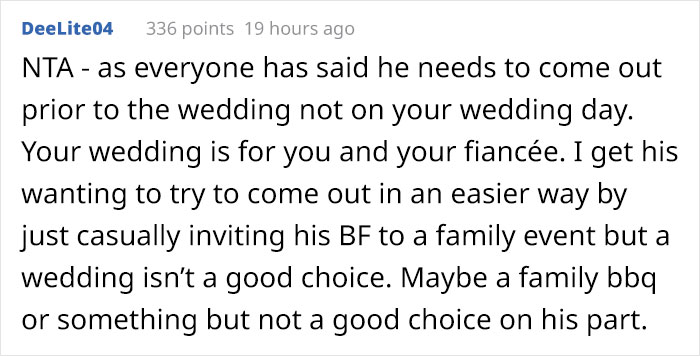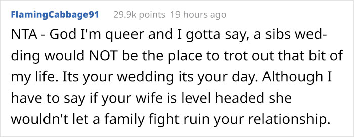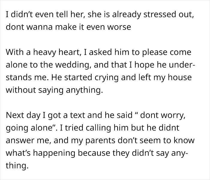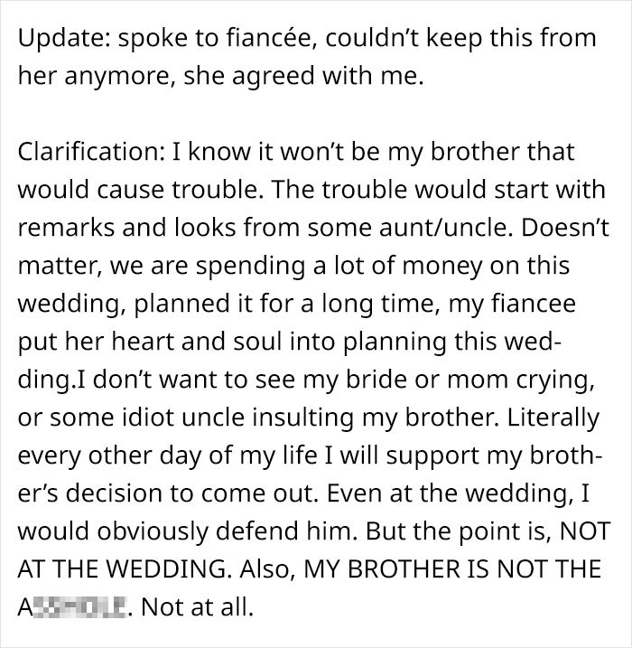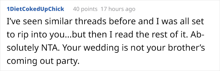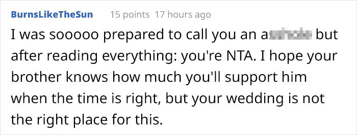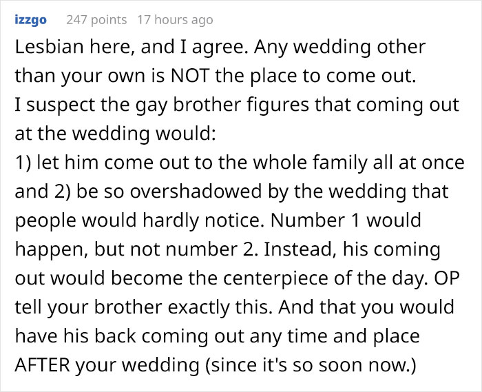 This particular scenario is difficult for a guy who has to choose between hurting his beloved brother’s feelings or potentially ruining his wedding – something that means the world to his fiancee.