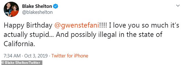 Blake took to Twitter to wish his girlfriend and wrote: ”Happy Birthday @gwenstefani!!!! I love you so much it’s actually stupid… And possibly illegal in the state of California.”