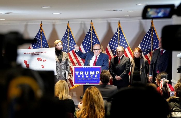 “What I’m describing for you is a massive fraud. It isn’t a little teeny one,” Giuliani said. “The president way ahead on election night.”