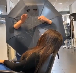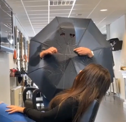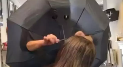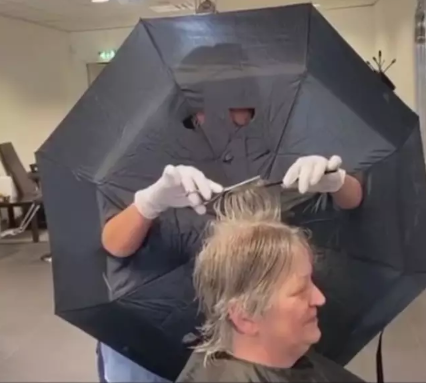 While the contraption made the stylist look funny and ridiculous, her innovation went viral on social media. Someone shared footage of the hairdresser working on a client’s hair while wearing the brolly.