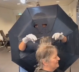 This creative stylist working at Bella Rosa salon located in Oss created a makeshift shield using a brolly, which had two armholes and eyeholes cut into it.