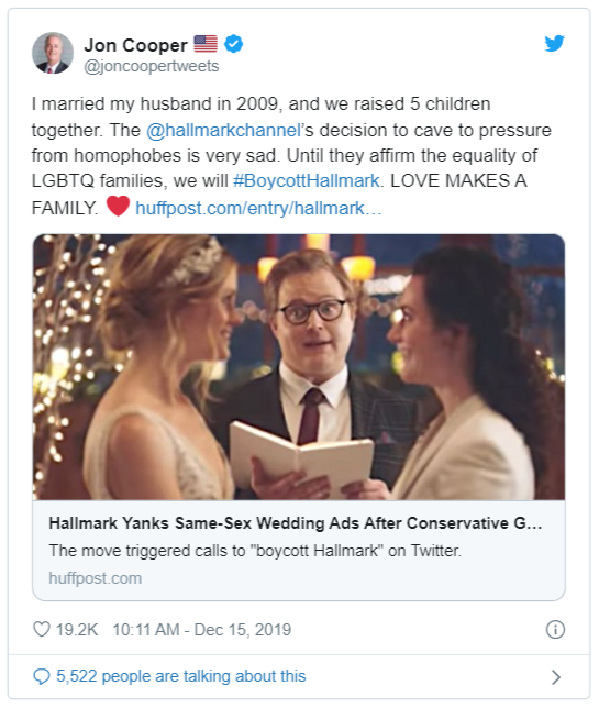 Mike Perry, the president and CEO of Hallmark, wrote on Twitter: “The Crown Media team has been agonizing over this decision as we’ve seen the hurt it has unintentionally caused.