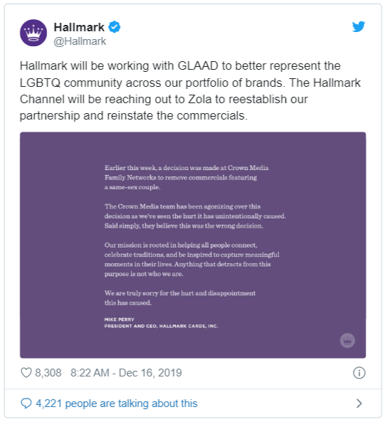 Hallmark cleared their stance on the matter, saying that they will be “working with GLAAD to better represent the LGBTQ community across our portfolio of brands” and “reaching out to Zola to reestablish our partnership and reinstate the commercials.”