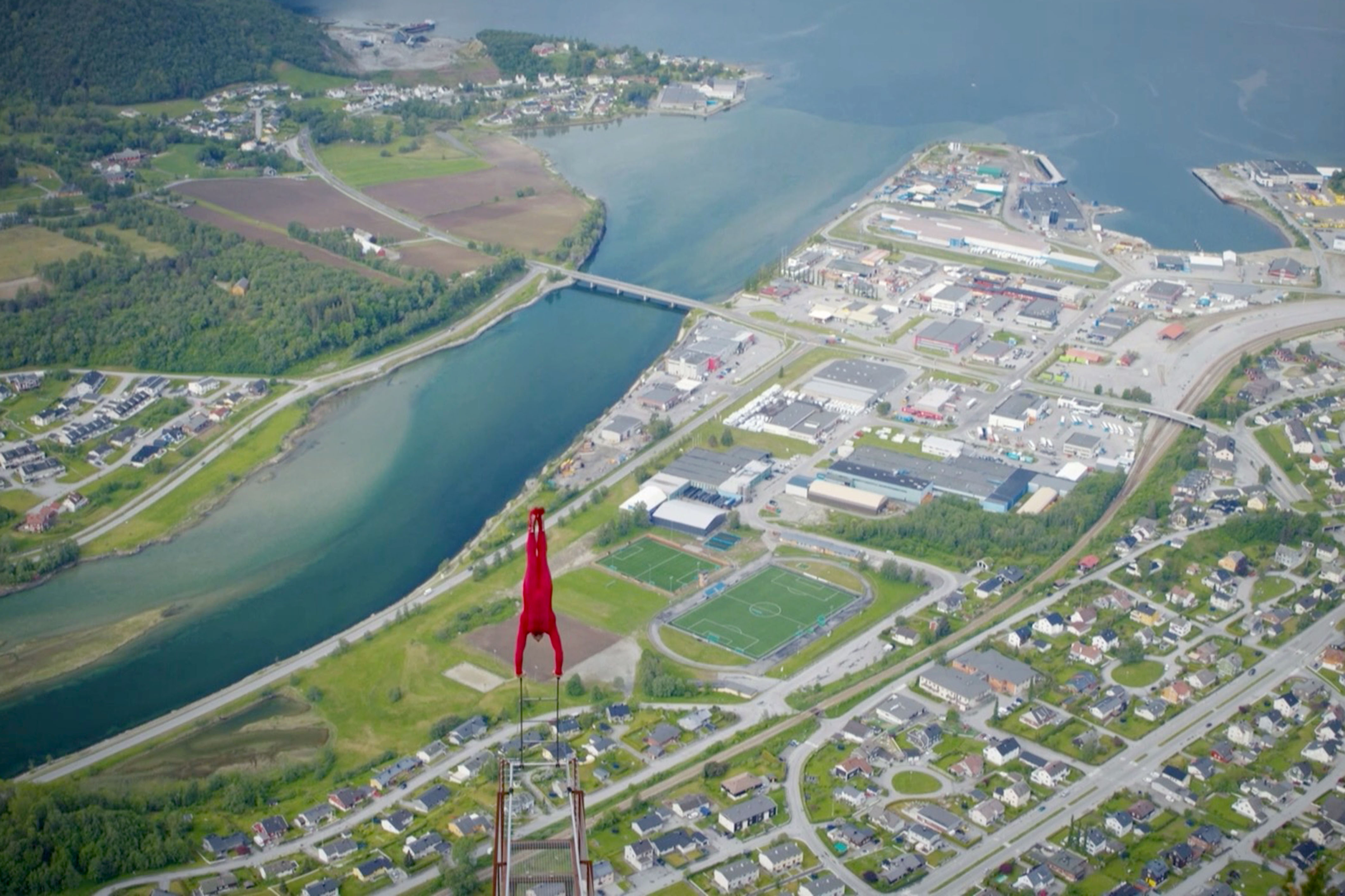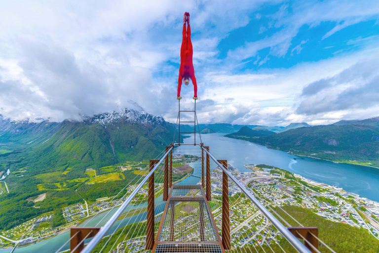 This thrilling performance of a professional performer, who hiked to the edge of a cliff, was recorded byEskilRønningsbakken at Rampestreken viewpoint in Åndalsnes, Norway on his fortieth birthday, June 24. What makes this performance dangerous is the height of the cliff, more than 1300ft.