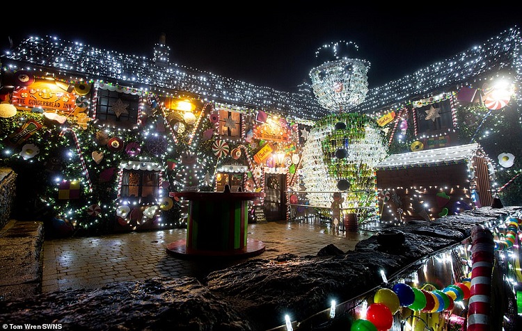 Four people worked tirelessly for eight days to make sure the exterior walls were covered in gingerbread men, candy canes, sweets, and 60,000 fairy lights that needed 5 km of wiring.