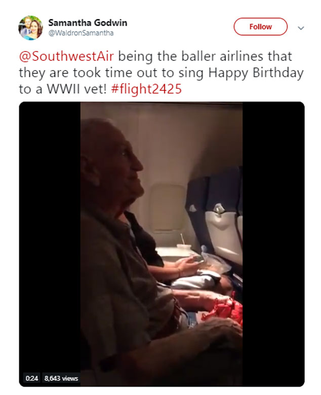 ‘@SouthwestAir being the baller airlines that they are took time out to sing Happy Birthday to a WWII vet.’ Credit: @WaldronSamantha)