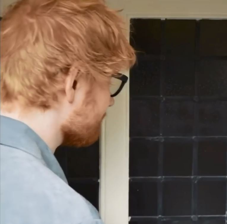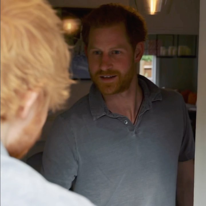 The clip shows Sheeran rings the doorbell which plays the melody of “God Save the Queen!”), then Prince Harry cheerfully greets his guest with a “Hi, mate.”