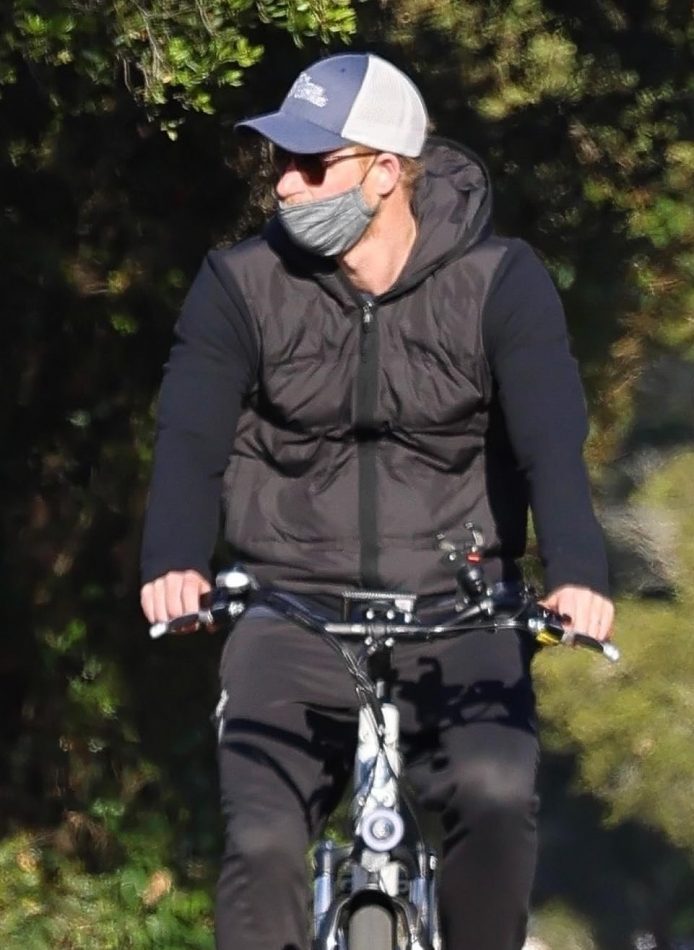 Prince Harry left Meghan and their son Archie at their $13 million home as he rode his electric bike through Montecito, California. His security team was seen trailing behind in a 4×4.