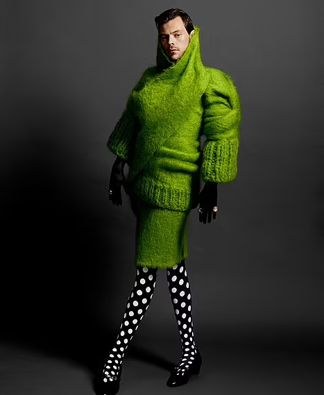 One of his shots shows him sporting an oversized green sweater, a mini skirt, onyx opera gloves, and black tights with white dots.