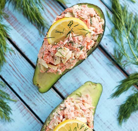 Mix together a teaspoon of Dijon, half teaspoon of Italian seasoning, and a tablespoon of balsamic vinegar with half a can of wild Alaskan salmon. Now, with salmon mixture, fill half an avocado.